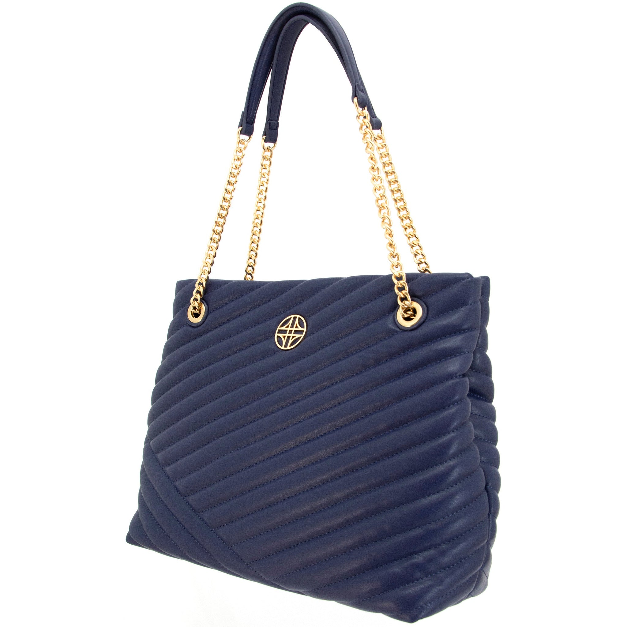 Flora is vegan leather, quilted tote featuring an open-top with snap tab closure and gold medallion detail. It has parallel, vegan leather handled, curb chain straps, and expanding side panels with snaps.