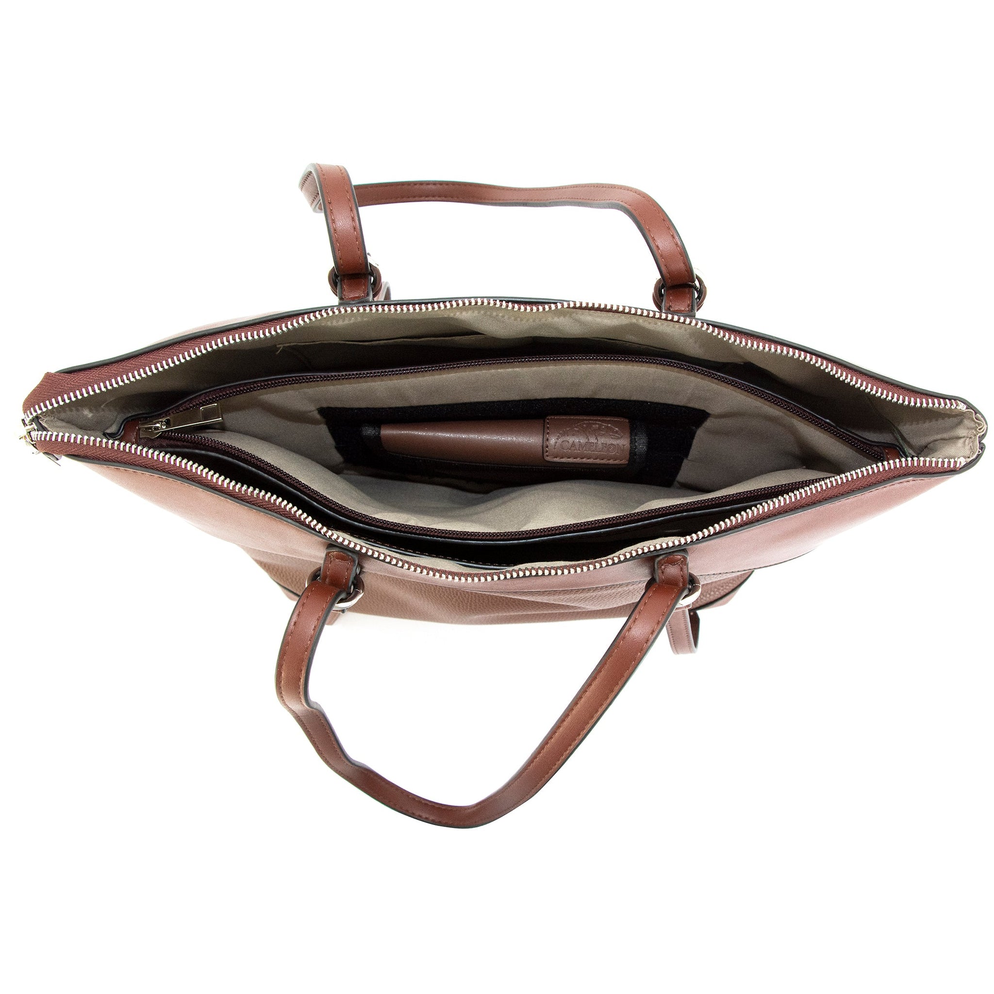With black or tan color options available, carry it as a shoulder bag or as a crossbody with the included adjustable longer strap. The CCW compartment is padded, with hook & loop lining one side, and comes equipped with a hook & loop holster to allow you to customize the placement within the pocket for maximum comfort and confidence while carrying!