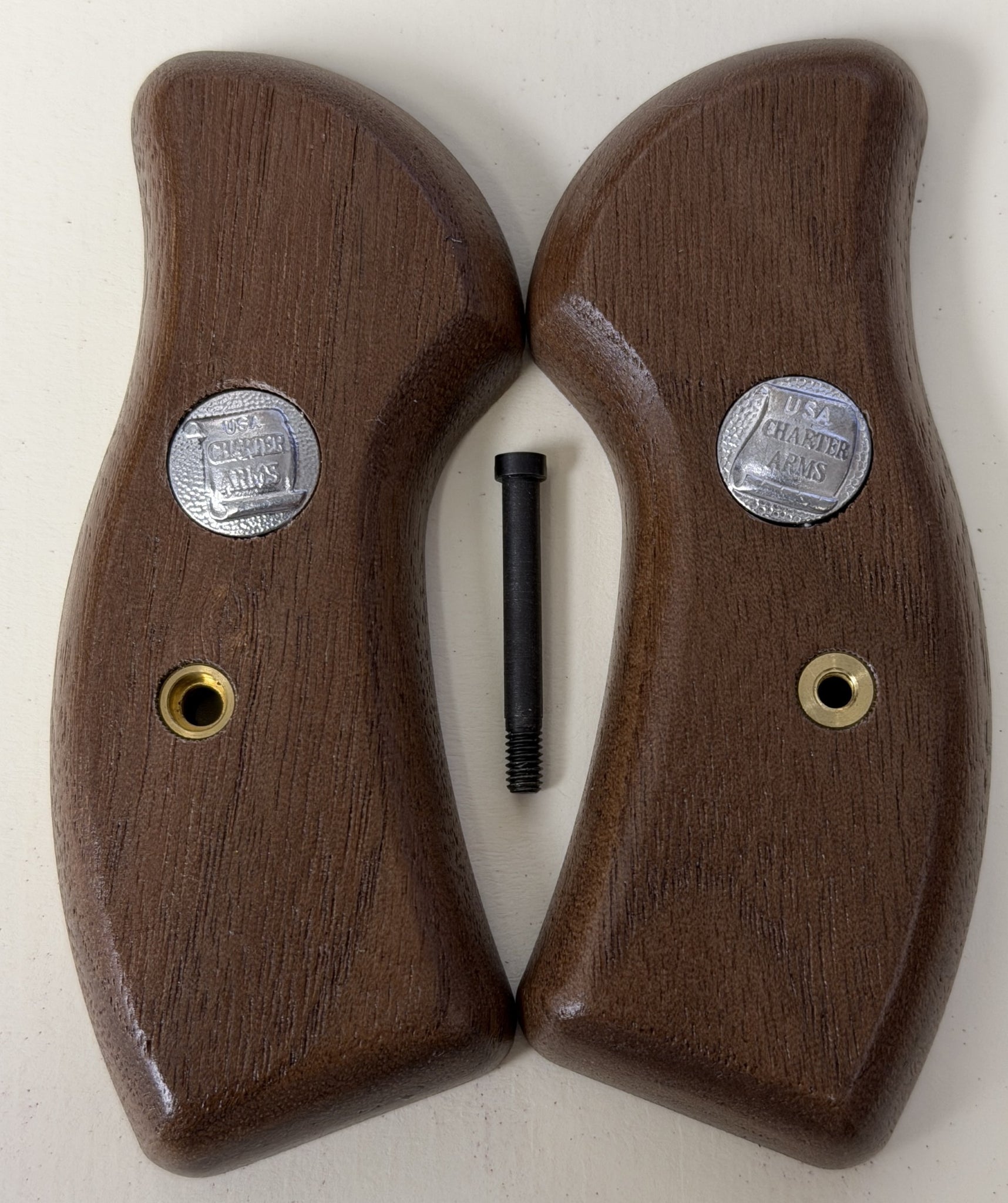 These original wooden grips are the original smooth panel style installed on the first Charter Arms revolvers. Made of walnut with the Charter Arms medallions on each side. Favored by many for the smooth feel, small profile favored by some for concealment.