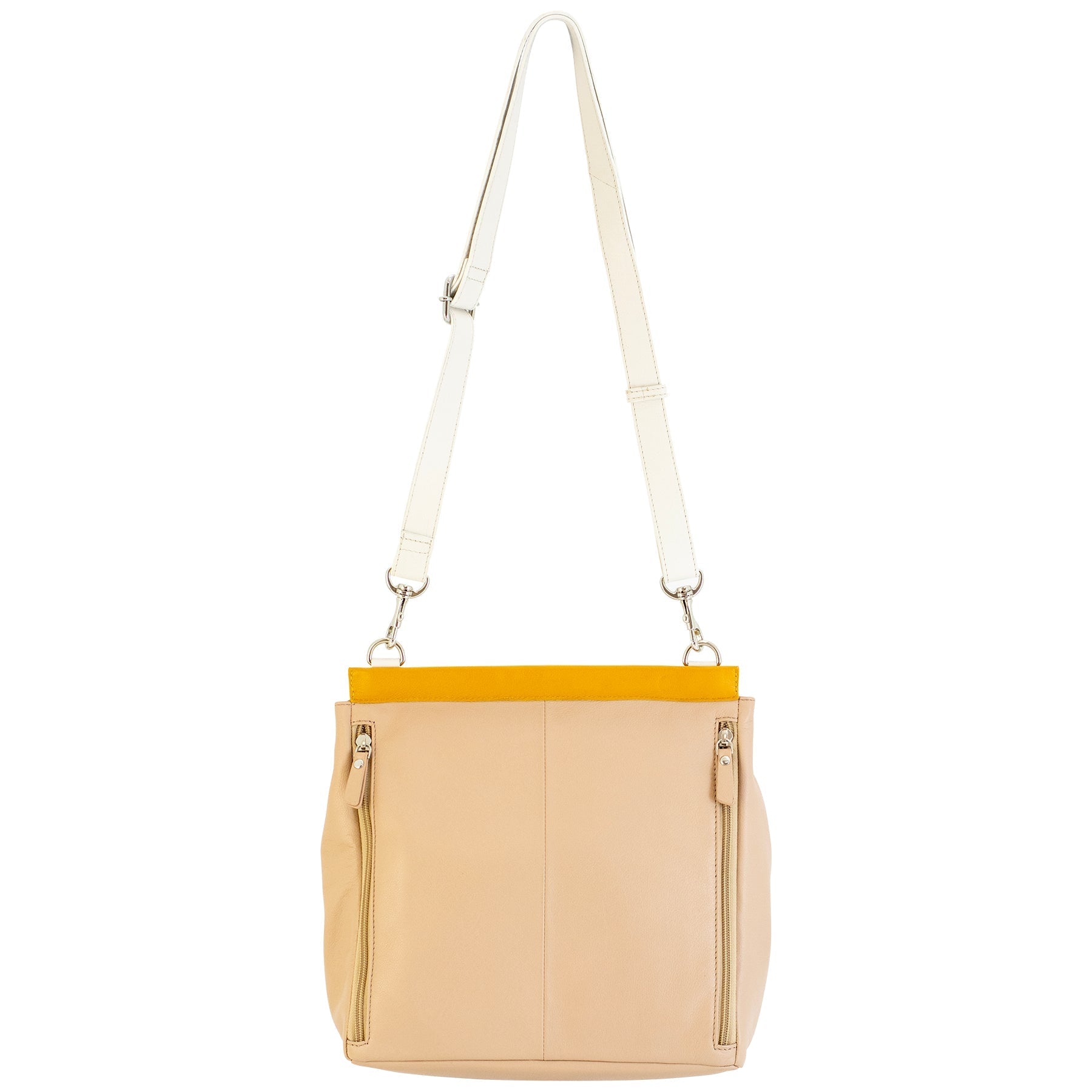 This medium-sized envelope crossbody bag is a combination of convenience and charm, masterfully crafted from soft leather in striking shades of yellow, beige, and white. The bag's exterior palette brings a pop of color to any outfit, with its multi-shaded design creating a unique pattern that stands out in the crowd.